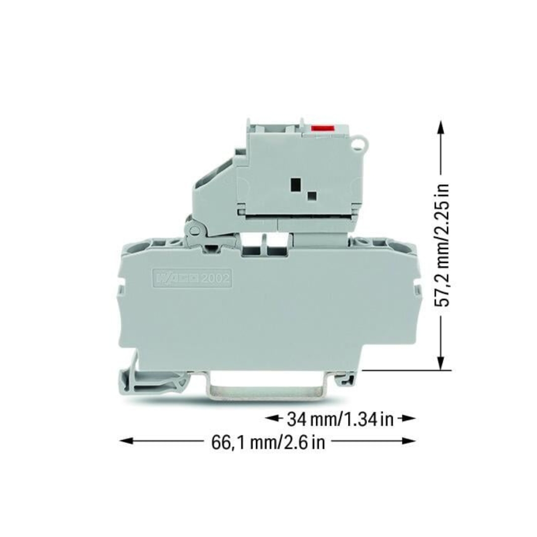 The Fuse Terminal Block (Item #2002-1611/1000-867) is a precision-engineered solution for secure, efficient circuit protection in industrial, hazardous, and railway environments. Certified for ATEX/IECEx (Ex ec IIC Gc) and compliant with IEC, UL, CSA, and railway standards, this DIN-35 rail-mounted block features Push-in CAGE CLAMP® technology for tool-free connections of solid or fine-stranded conductors (0.25–4 mm²). Designed for 120V (UL/CSA/Ex) and 250V (IEC) applications, it offers robust surge protection (6 kV IEC) and a pivoting fuse receptacle for 5x20mm cylindrical fuses. The flame-retardant polyamide (PA66) housing, extended operating range (-60°C to +105°C), and railway-grade vibration/shock resistance ensure reliability in extreme conditions.