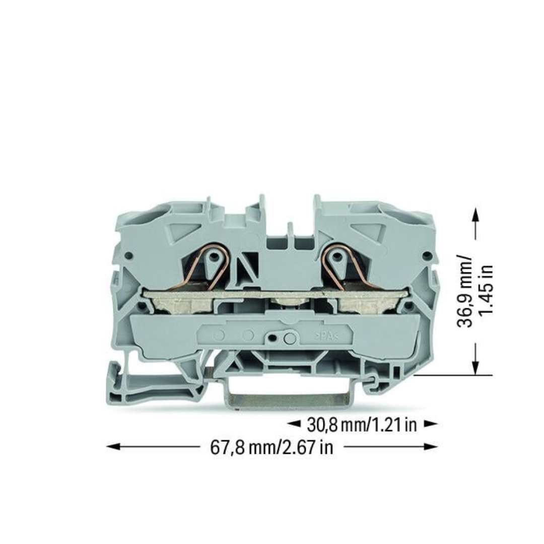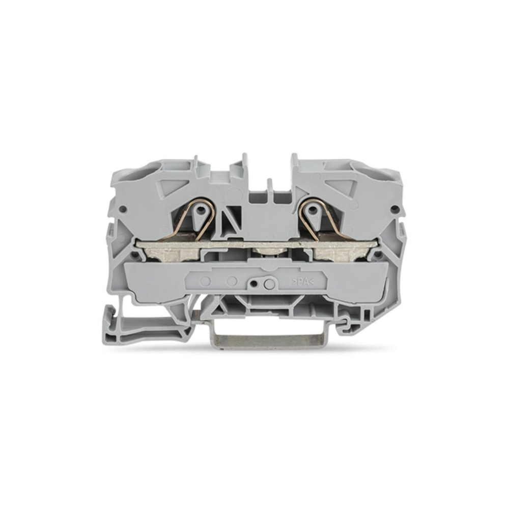 The WAGO 2010-1201 2-Conductor Through Terminal Block is an advanced, versatile connection solution designed for reliable and efficient electrical installations. With its Push-in CAGE CLAMP® technology, this terminal block simplifies the wiring process, allowing for quick, tool-free connections of both solid and fine-stranded conductors. It is ideal for use in industrial, building, and Ex e II applications, offering superior durability and safety. This rail-mount terminal block is designed to fit on DIN-35 rails and is compatible with a wide range of conductor sizes, from 0.5 mm² to 16 mm². Its high-quality polyamide housing ensures insulation and resistance to harsh conditions, making it an excellent choice for demanding environments. The gray terminal block features both center and side marking for easy identification, and it meets the latest environmental and safety standards.