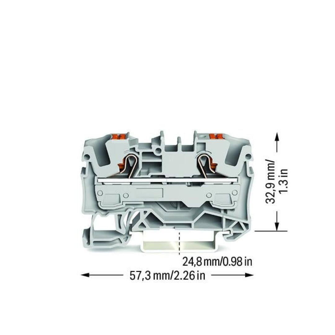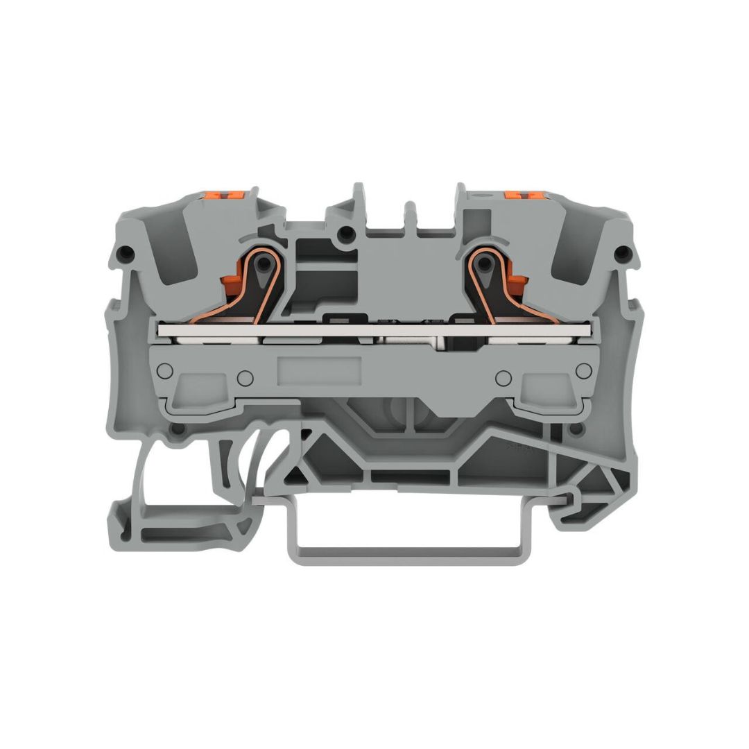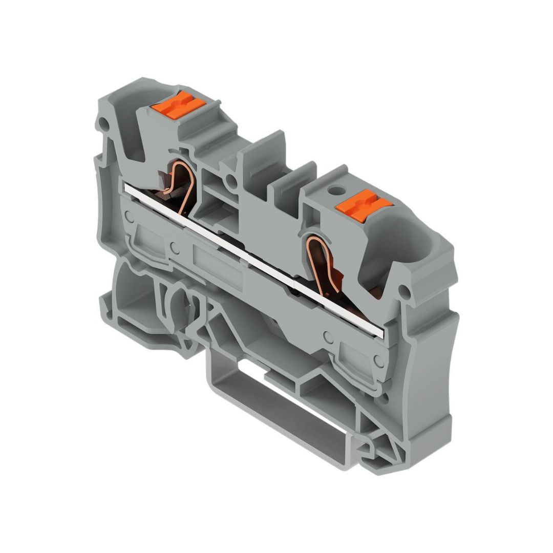 The WAGO 2206-1201 2-Conductor Through Terminal Block is a reliable and efficient solution for securing electrical connections in industrial and building applications. With its Push-in CAGE CLAMP® technology, this terminal block allows for fast, tool-free insertion of both solid and fine-stranded conductors, making installation quicker and more convenient. Featuring a gray polyamide (PA66) housing, it ensures excellent insulation and durability. The terminal block is designed for use with DIN-35 rails and is equipped with a push-button for easy operation. It supports conductor cross-sections from 0.5 mm² to 10 mm² and offers a rated current of 41 A with a rated voltage of 800 V. Ideal for both through-wiring and potential distribution, this terminal block is a versatile component for modern electrical installations.
