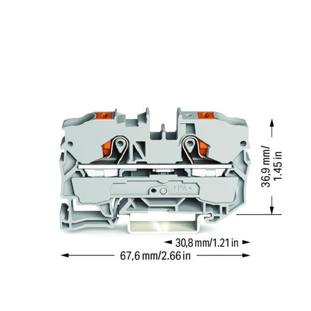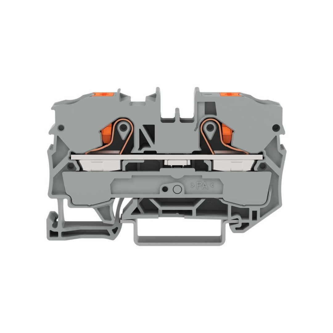 The WAGO 2210-1201 2-Conductor Through Terminal Block is an advanced solution for secure and efficient electrical installations. Featuring Push-in CAGE CLAMP® technology, this terminal block allows for fast and tool-free connections of solid and fine-stranded copper conductors, with cross-sections ranging from 0.5 mm² to 16 mm². It provides a reliable connection with a rated voltage of 800 V and a maximum current rating of 57 A. Ideal for use in industrial environments, the terminal block offers front-entry wiring and is designed for mounting on DIN-35 rails. The unit’s robust gray polyamide (PA66) housing ensures long-lasting durability, while its integrated test port and push-button actuation add convenience for installation and maintenance. This terminal block also complies with various IEC, UL, and CSA approvals, making it a versatile choice for applications that require strict safety standards.