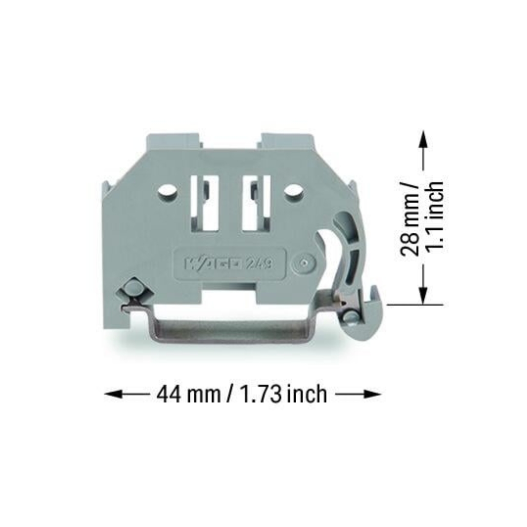 The WAGO 249-116 Screwless End Stop is the ideal solution for securing rail-mount terminal blocks to DIN rails without the need for any tools. Designed for both DIN-35 35 x 7.5 mm and 35 x 15 mm rails, this end stop uses a simple snap-on mechanism to secure the blocks in place, ensuring fast and reliable installation. Made from high-quality polyamide, the end stop offers superior durability and is flame retardant (UL94 V0). It also features three marker slots for easy labeling and a snap-in hole for adjustable height group marker carriers. Whether mounted vertically or horizontally, this end stop guarantees the safe and economical securing of terminal blocks.
