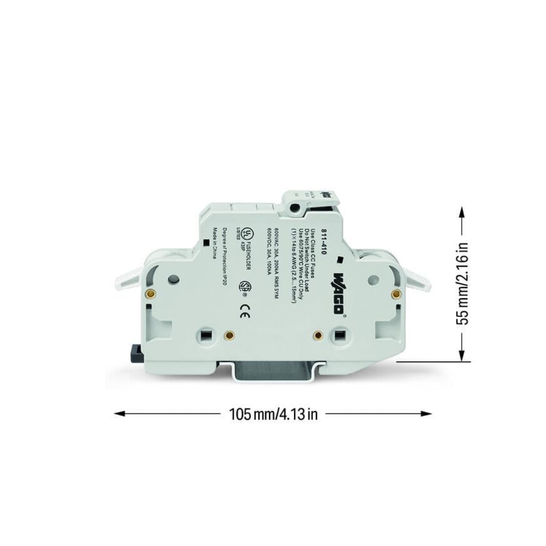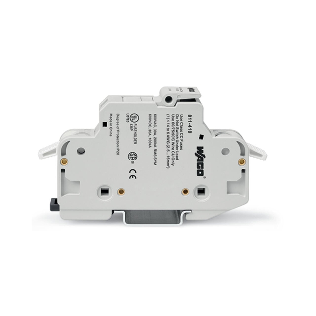 The WAGO 811‑410 is a robust 2‑conductor fuse terminal block designed for fast, tool‑free electrical protection in control panels and distribution systems. It accepts Class CC cylindrical fuses (10 × 38 mm) and features WAGO’s maintenance‑free CAGE CLAMP® connection technology, ensuring secure copper conductor terminations without ferrule crimping. Rated for 600 V AC/DC and up to 30 A, its compact 17.5 mm width and side‑entry wiring make it ideal for space‑constrained DIN‑rail installations. The light‑gray polyamide housing (PA66, UL94 V0) provides high insulation and durability across –35 °C to +85 °C.
