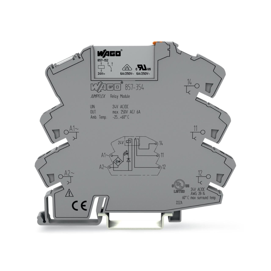 The WAGO 857‑354 Relay Module is a slim 6 mm DIN‑rail mount interface designed for versatile AC/DC control applications. With a universal 24 V AC/DC coil input and one changeover (SPDT) contact rated for 6 A continuous, it reliably switches both AC and DC loads. A yellow LED provides clear status indication, while Push‑in CAGE CLAMP® terminals enable fast, tool‑free wiring of 0.34 – 2.5 mm² conductors. Reinforced insulation between coil and contact, double insulation between like modules, and compliance with ATEX/IECEx make it suitable for safe operation in harsh industrial environments.