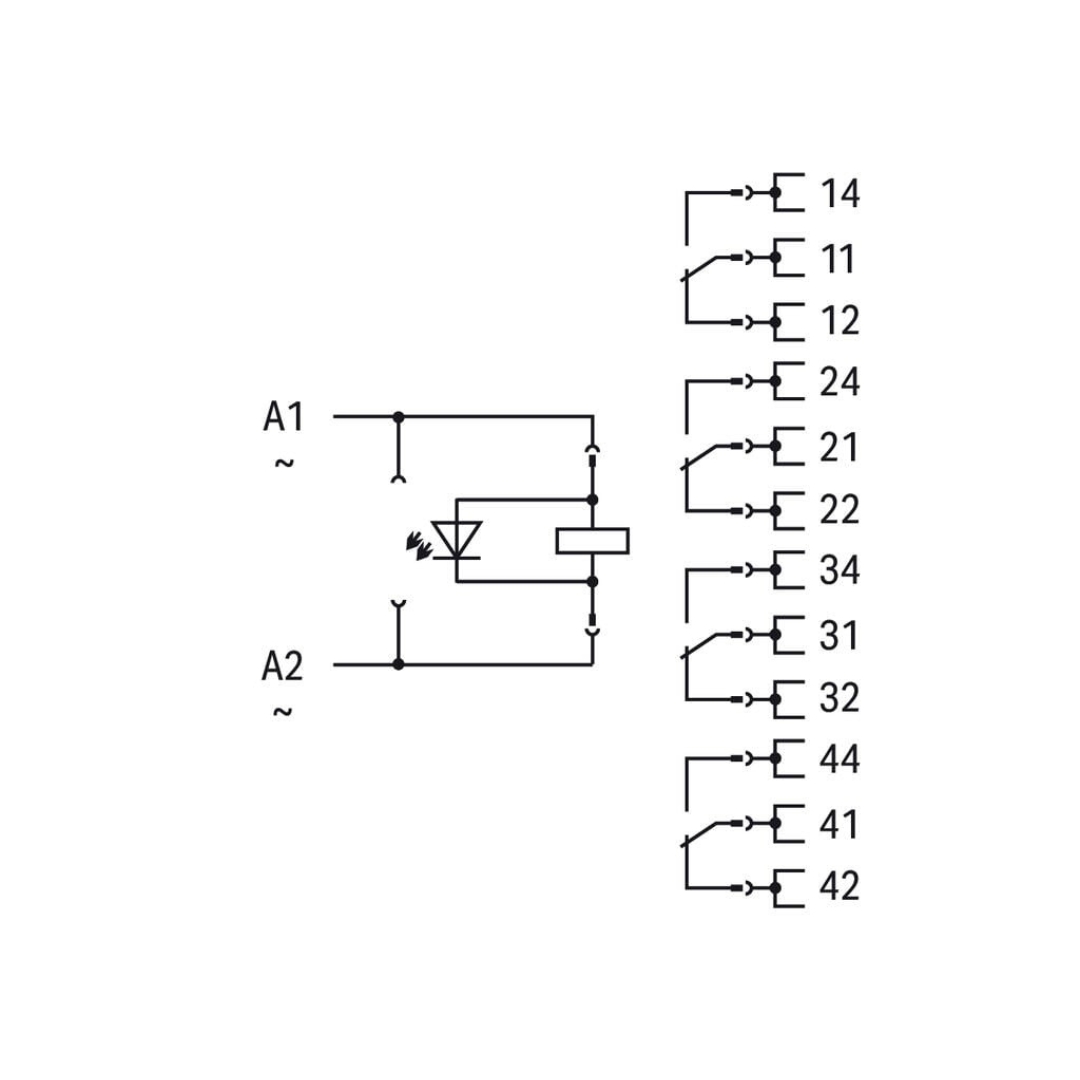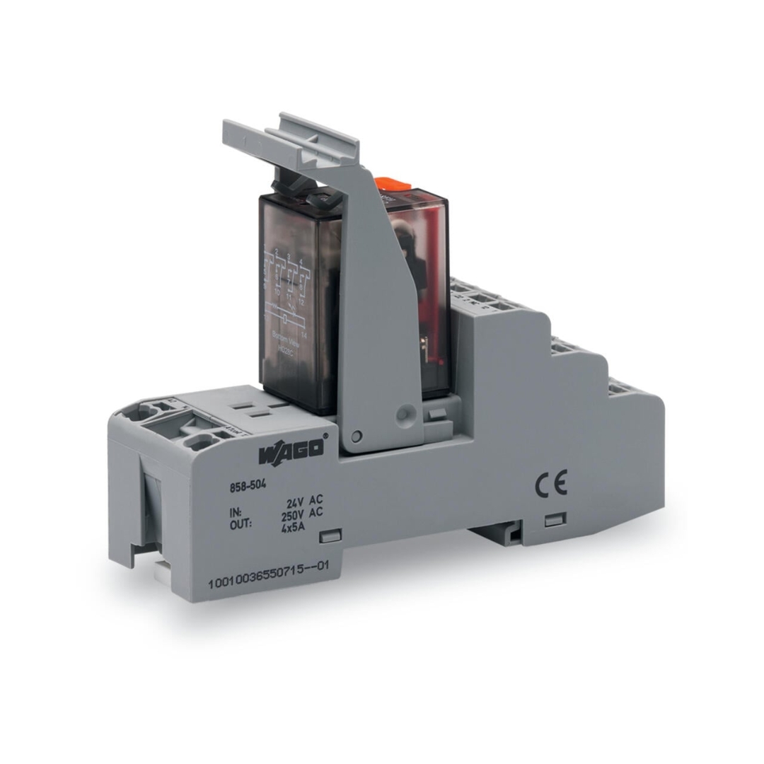 The WAGO 858‑504 Relay Module is a robust 31 mm‑wide DIN‑rail mount interface featuring four changeover (SPDT) contacts driven by a 24 VAC coil. Ideal for AC control applications, it supports manual override for testing and maintenance. Each AgCe contact switches up to 5 A continuously (15 A inrush) at 250 VAC. A red LED provides clear status feedback. Push‑in CAGE CLAMP® terminals enable fast, tool‑free wiring of 0.34 – 1.5 mm² conductors. IP20 protection and wide operating temperatures (–25 … +70 °C) ensure reliable performance in industrial environments.