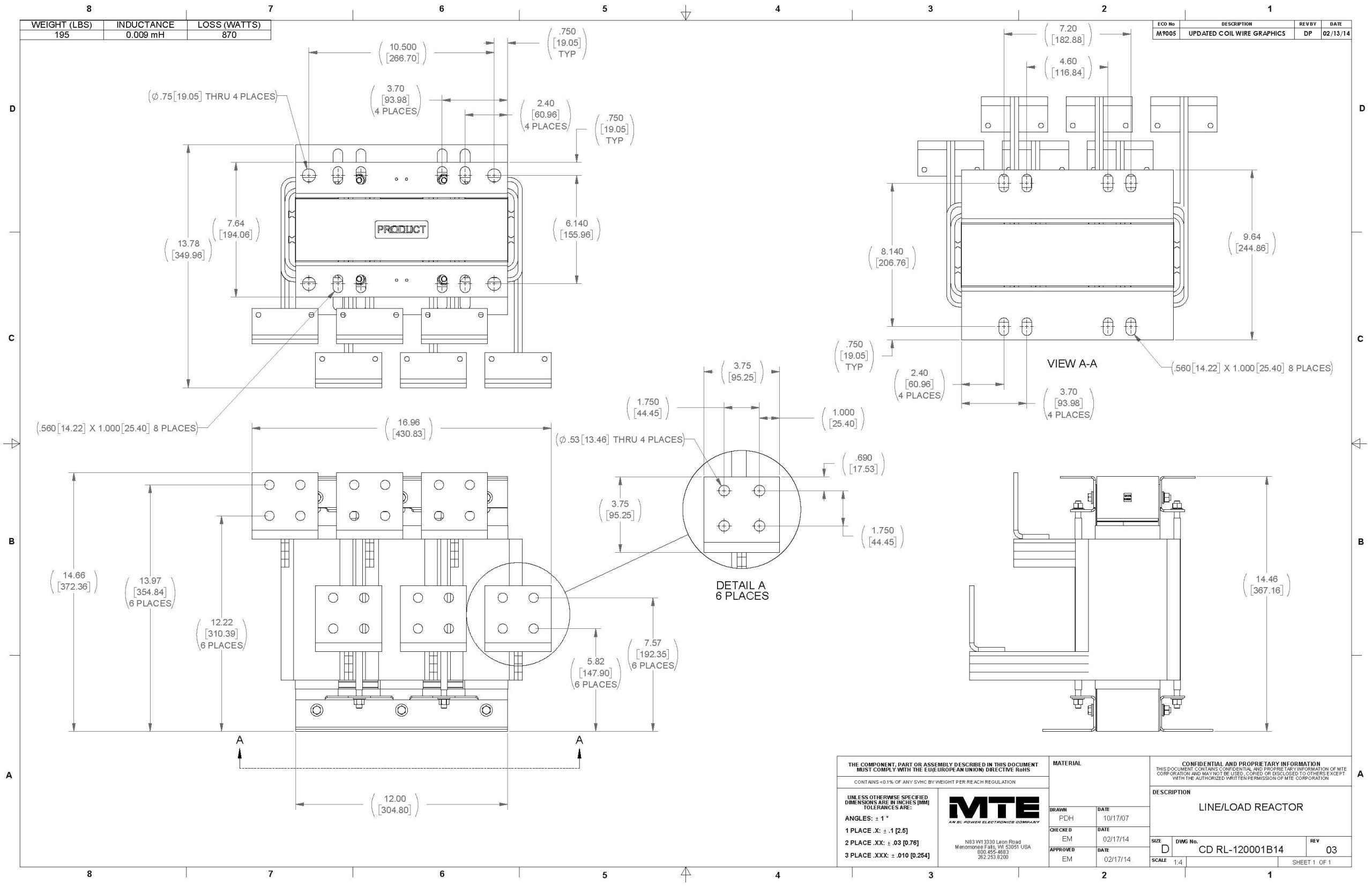 RL-120001B14 – MTE | Line/load Reactor, 0.009mH, 1200Amps, Open