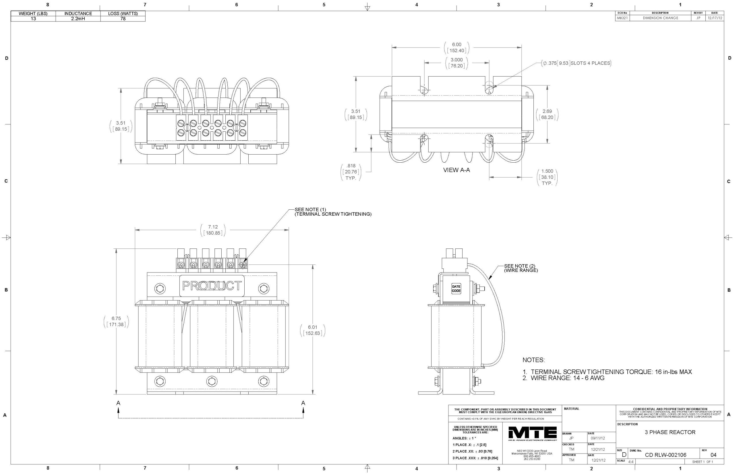 The MTE RLW-002106 reactor is designed to enhance the reliability and performance of electrical systems by mitigating power line disturbances. This 3-phase, 2.2mH inductance reactor with a 21A current rating is ideal for various applications, including power conversion units and rectifiers. Its open design ensures optimal cooling and performance in demanding environments.
