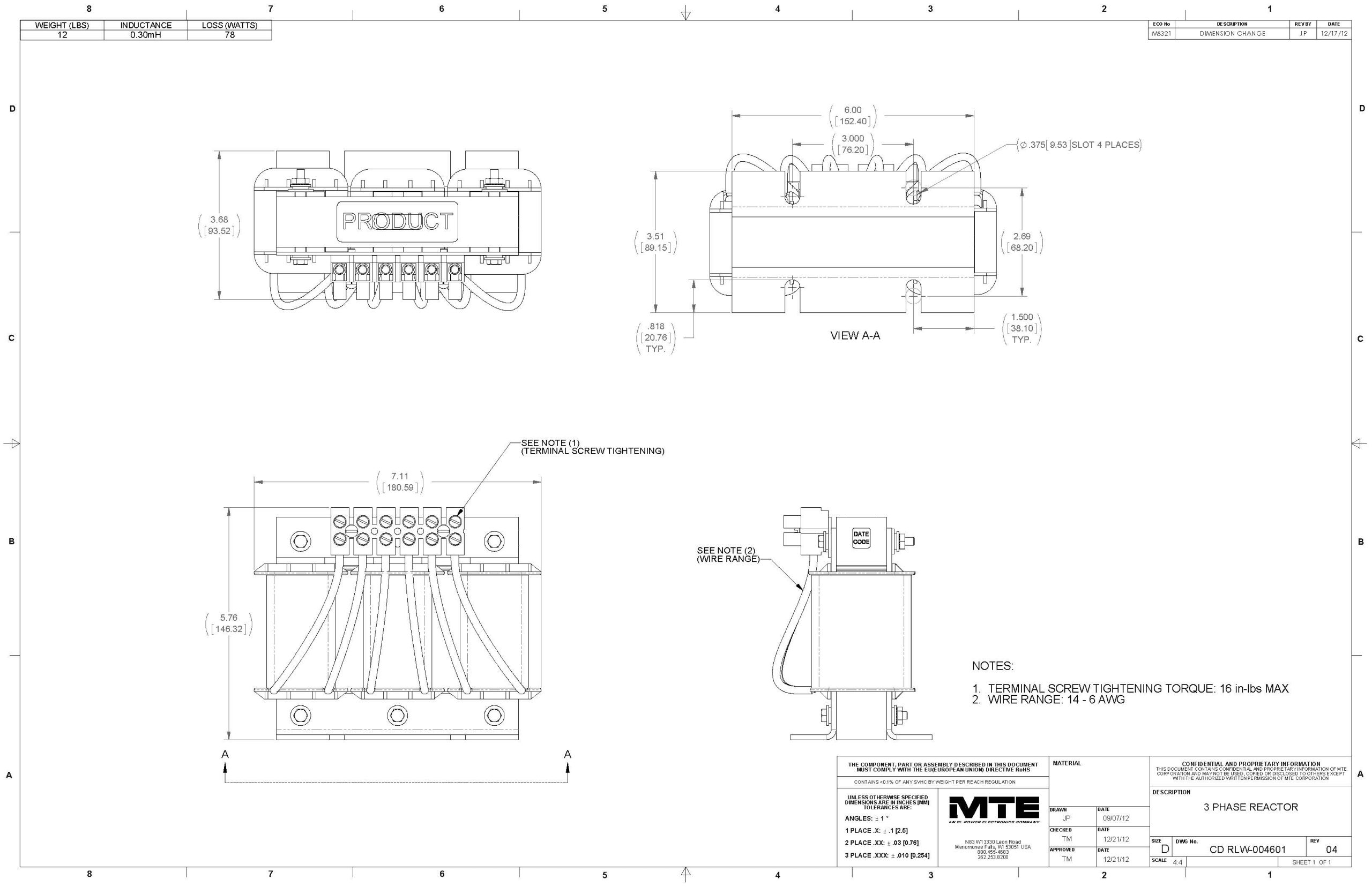The MTE RLW-004601 reactor is engineered to provide robust protection and enhance the performance of electrical equipment by absorbing power line disturbances. With a current rating of 46 amps and an inductance of 0.3mH, this reactor is optimized for medium current applications. The open design ensures efficient heat dissipation, making it suitable for environments where enclosure protection is not a primary concern.