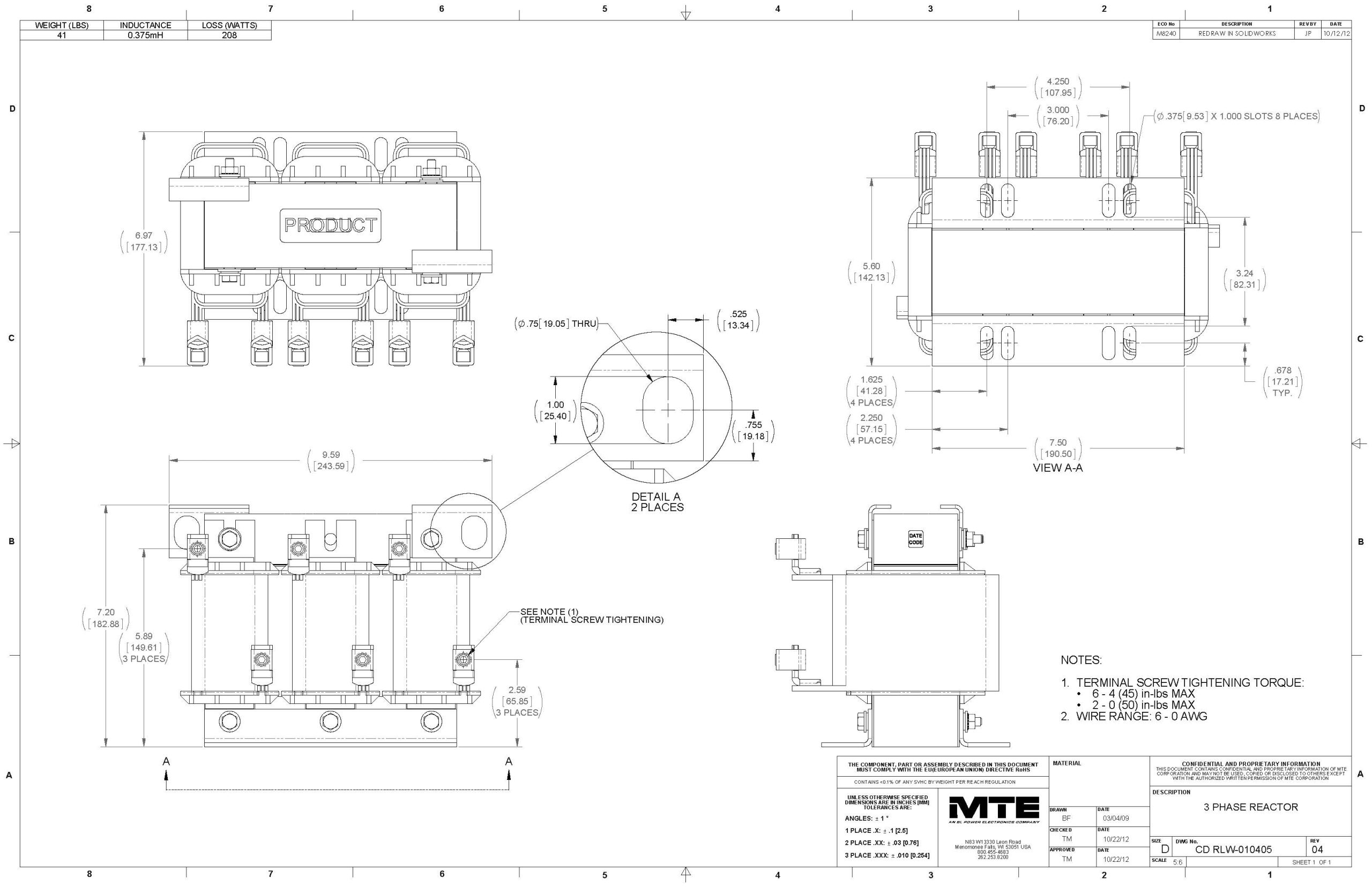 The MTE RLW-010405 reactor is designed to enhance the stability and efficiency of industrial power systems. With a current rating of 104 amps and an inductance of 0.375mH, it effectively filters power line disturbances, ensuring the smooth operation of equipment. This reactor is RoHS and REACH compliant, meeting stringent environmental standards. Its open design allows for efficient heat dissipation, ensuring reliable performance even in demanding environments. The epoxy impregnation minimizes audible noise and enhances structural integrity, making it suitable for various industrial applications. Terminal block connections simplify wiring, facilitating ease of installation. With CE and UL approvals, this reactor guarantees compliance with international quality and safety standards.