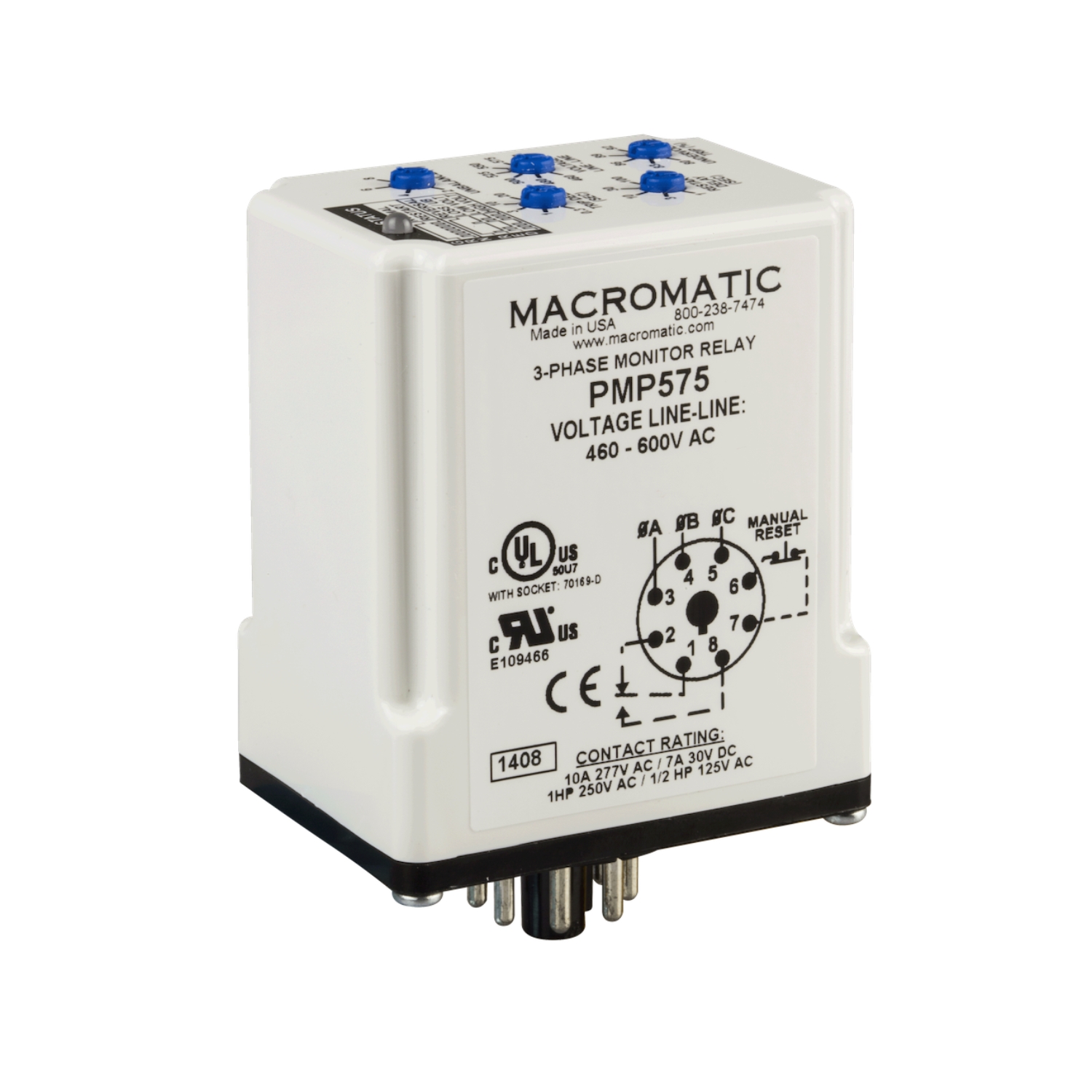 The Macromatic PMP575 is a high-performance PMD Series phase monitoring relay designed to provide comprehensive protection for three-phase systems operating between 460V and 600V. This universal voltage unit is engineered to safeguard motors and sensitive equipment against five critical fault conditions: phase loss, phase reversal, phase unbalance, undervoltage, and overvoltage. Featuring a standard 8-pin octal plug-in design, the PMP575 is easily socket-mounted for rapid installation or replacement. Its bi-color LED provides immediate visual feedback, glowing green for normal operation and shifting to red to indicate specific fault conditions, making it an essential tool for maintaining uptime in industrial environments.