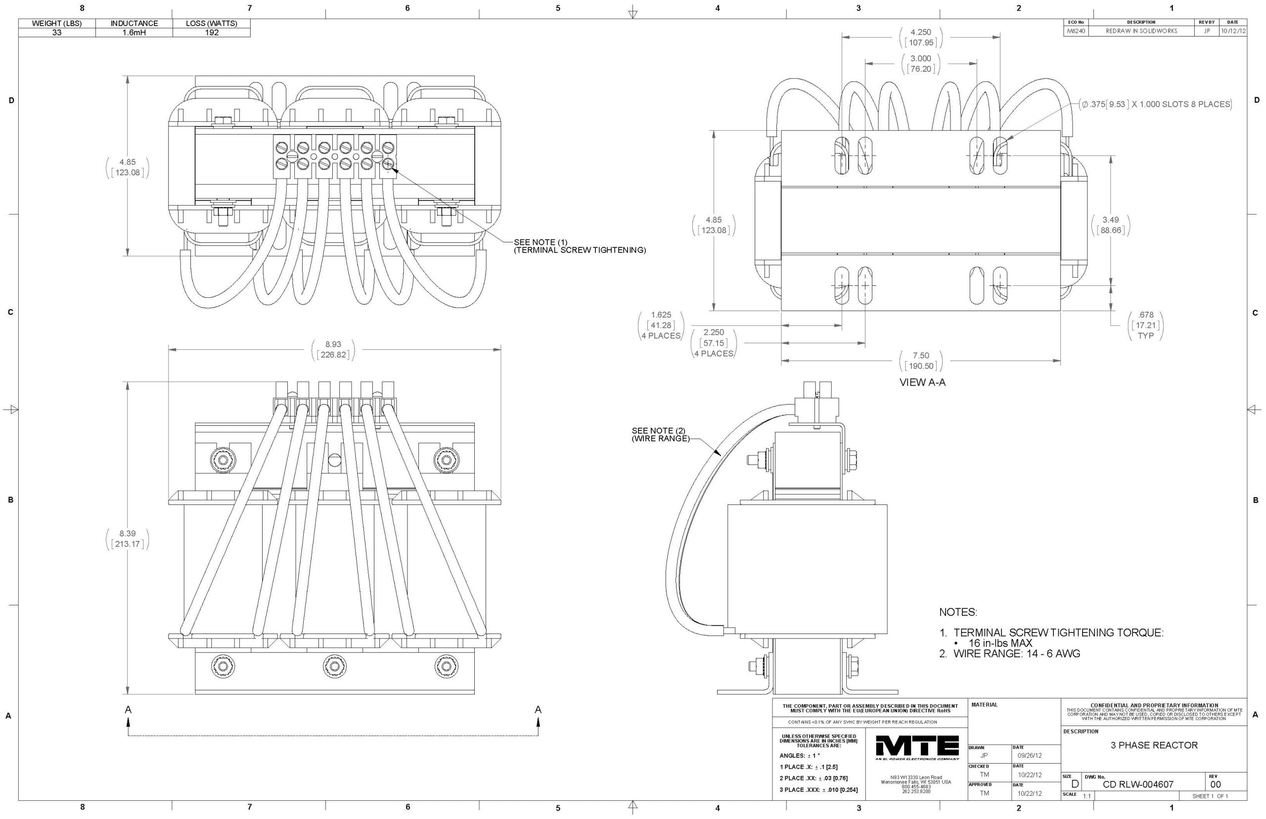 The MTE RLW-004607 reactor is part of the RLW series, specifically designed to enhance the performance and longevity of electronic equipment by mitigating power line disturbances. It features an inductance of 1.6mH and a current rating of 46A, making it suitable for various industrial applications.