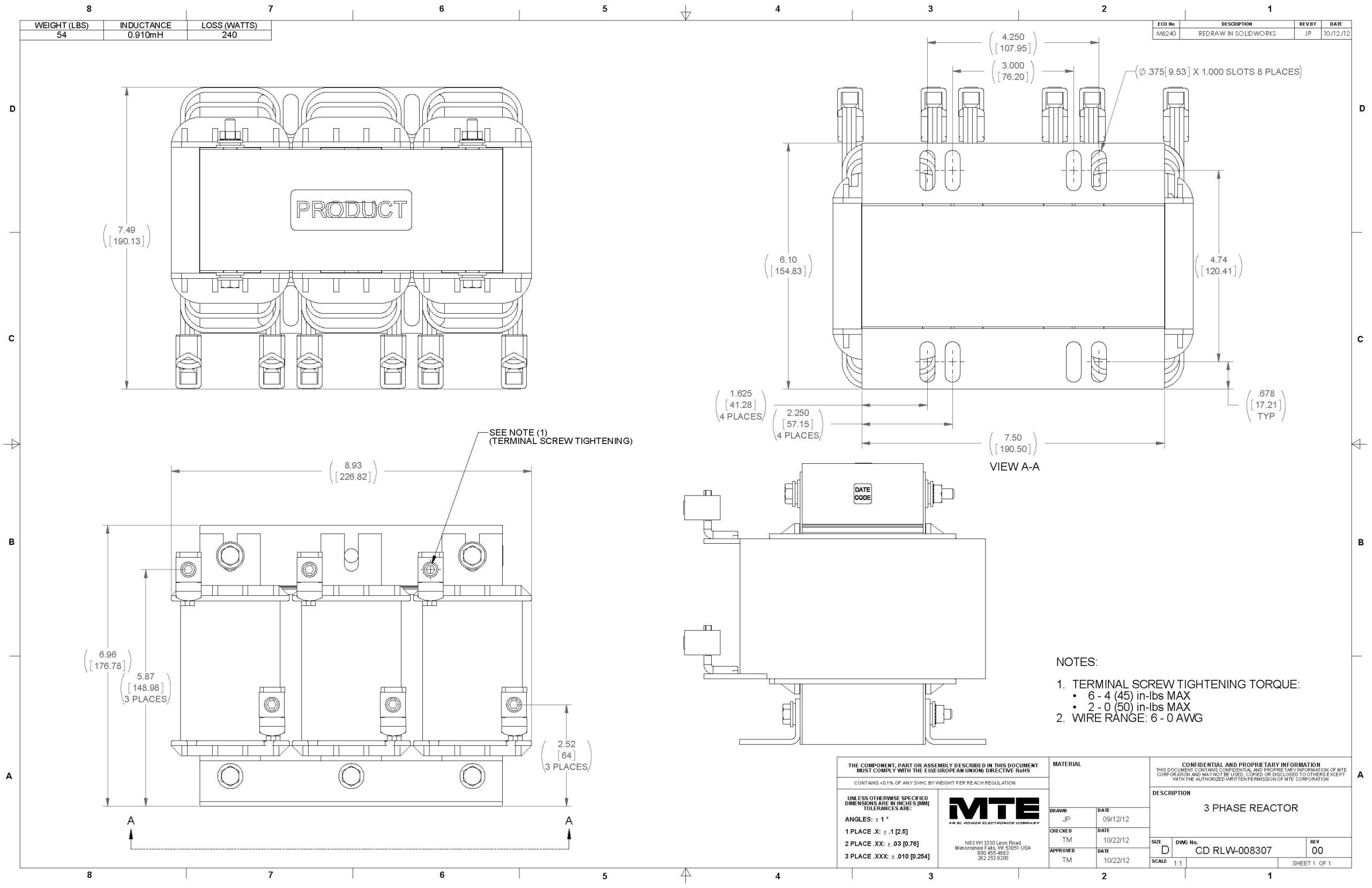 The MTE RLW-008307 reactor is designed to enhance the longevity and performance of electronic equipment by mitigating power line disturbances. This model, part of the RLW series, features an inductance of 0.91mH and a current rating of 83A, suitable for various industrial applications.